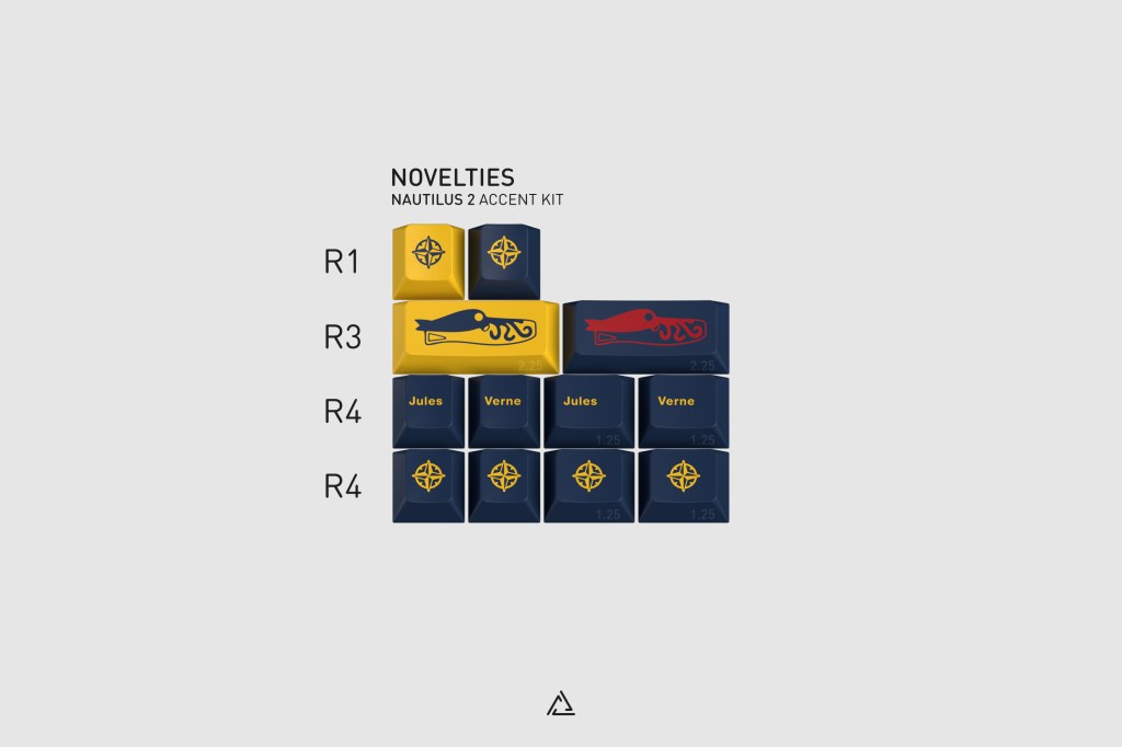 “I wasn’t happy with how the round 1 novelties, so for Nautilus 2 my goal was to revamp the kit with text novelties and some new icons. However, before I posted the project page I scrapped them and only kept the text novelties. I have added it as a winkey or function row replacement. Also, dropped the «Nemo» novelty as it felt out of place.”