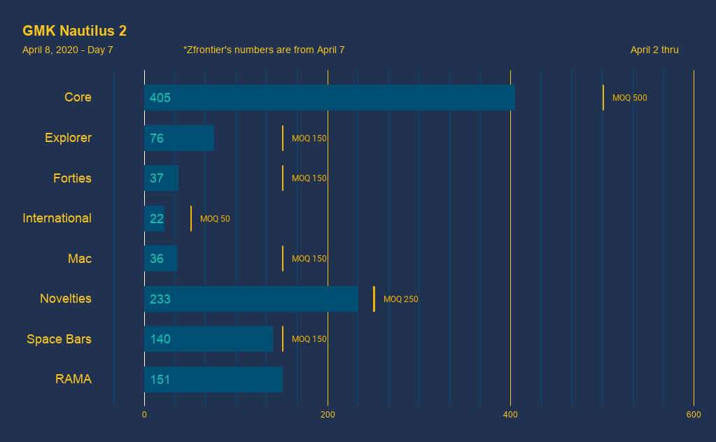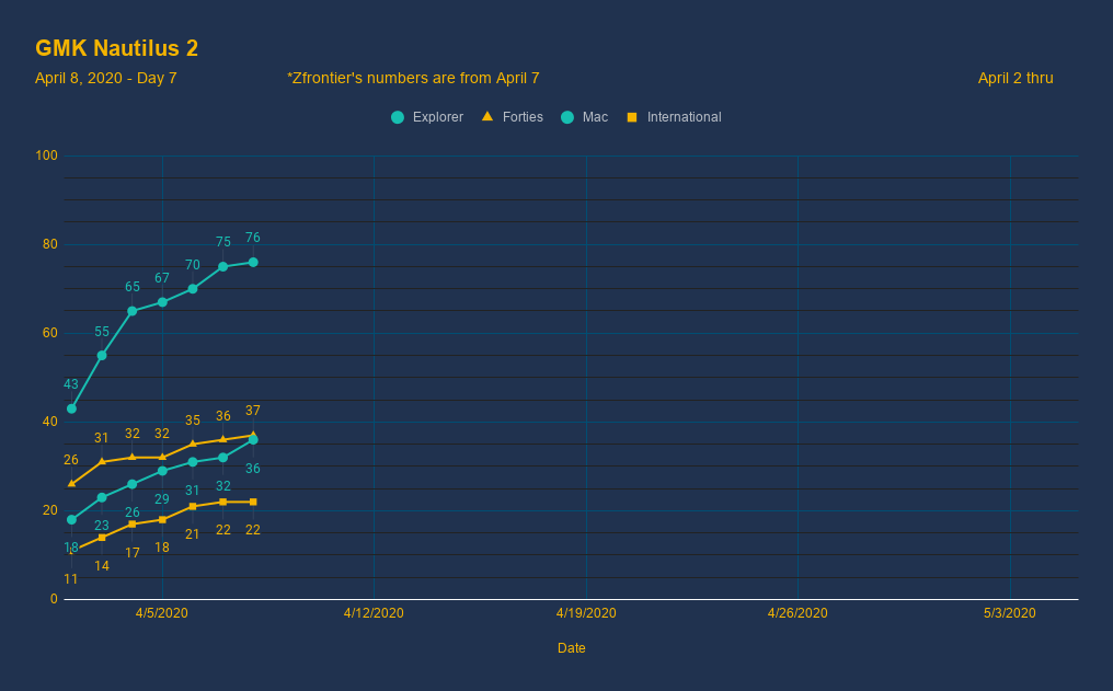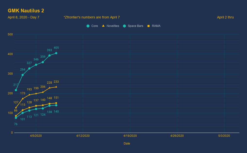 As for the extension kits, Explorer has already reached 75 units and is halfway its MOQ, while Forties and Mac are at one quarter of their respective MOQs. We’ll have to keep a close eye to these kits during week 2 and see how they evolve.