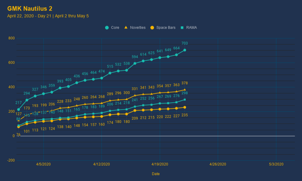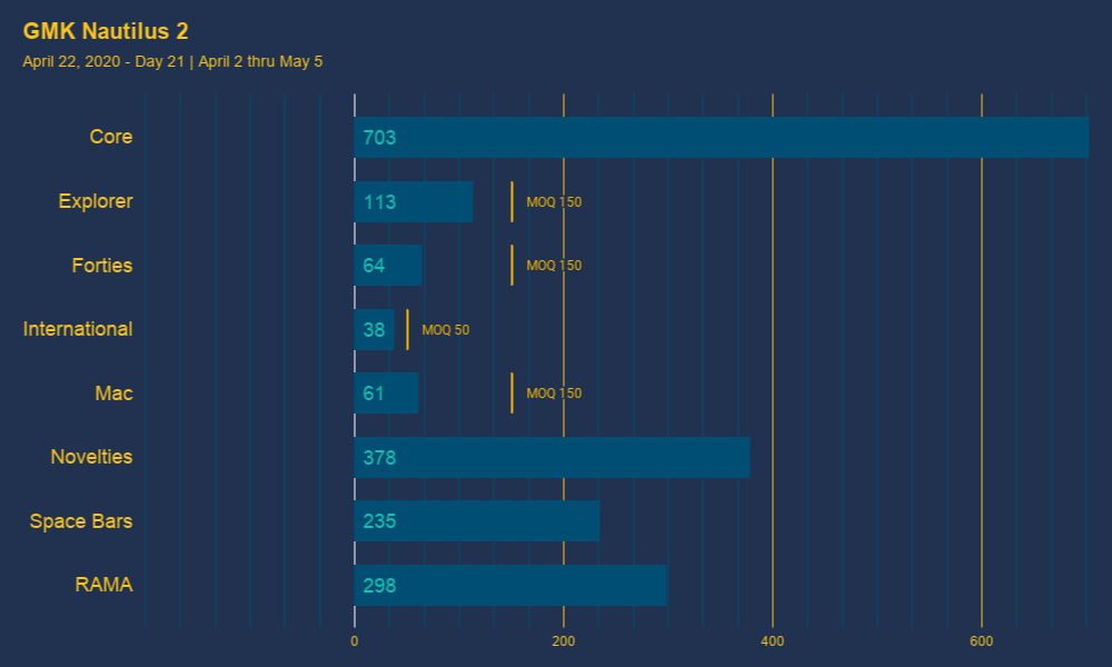 Another week, another recap! With Core, Novelties, Space Bars and the RAMA × Nautilus 2 enter key reaching MOQ (minimum order quantity), I’ll be focusing this week’s recap on the Extension kits, here is how Nautilus 2 has done during week three: