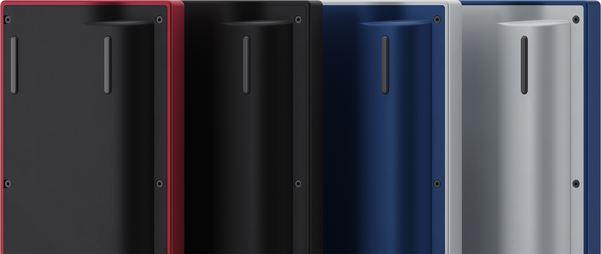 The bead-blasted, then anodized aluminium enclosures are offered in four carefully picked colour combos, all of them with an internal black brass weight and the plate of your choice.