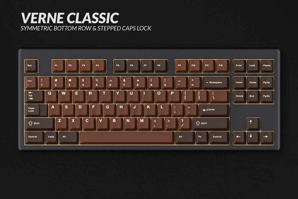 - Verne Classic: a symmetric bottom row, with a 7.00U spacebar and two 1.50U modifiers and a 1.00U modifier on each side; as well as a stepped Caps Lock key.